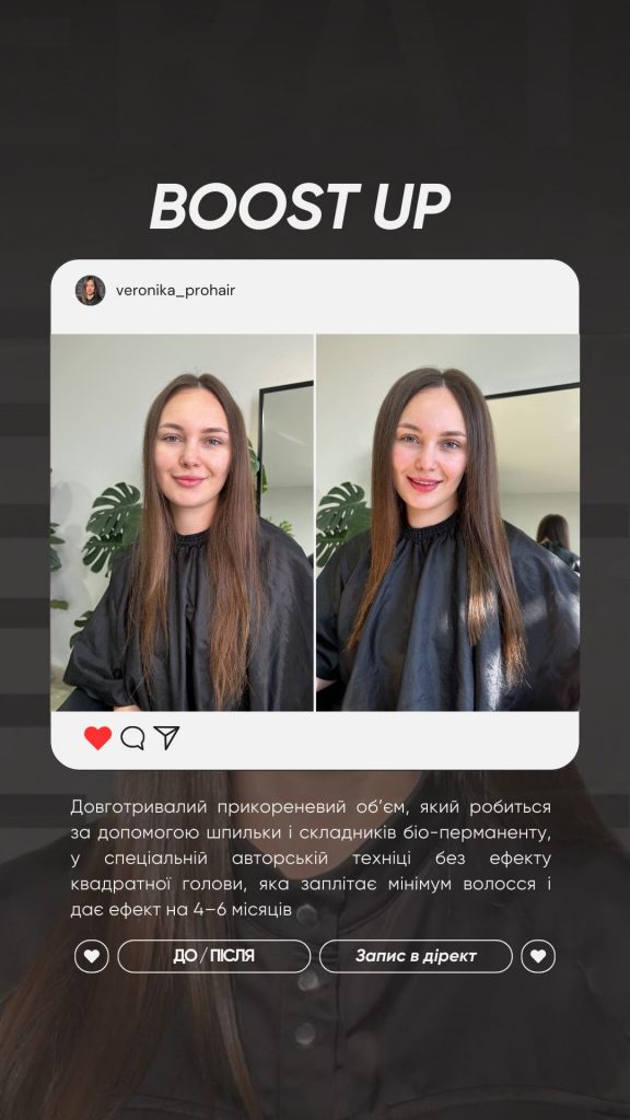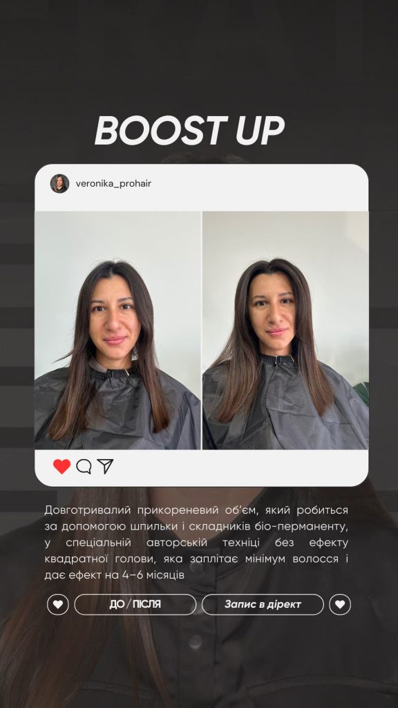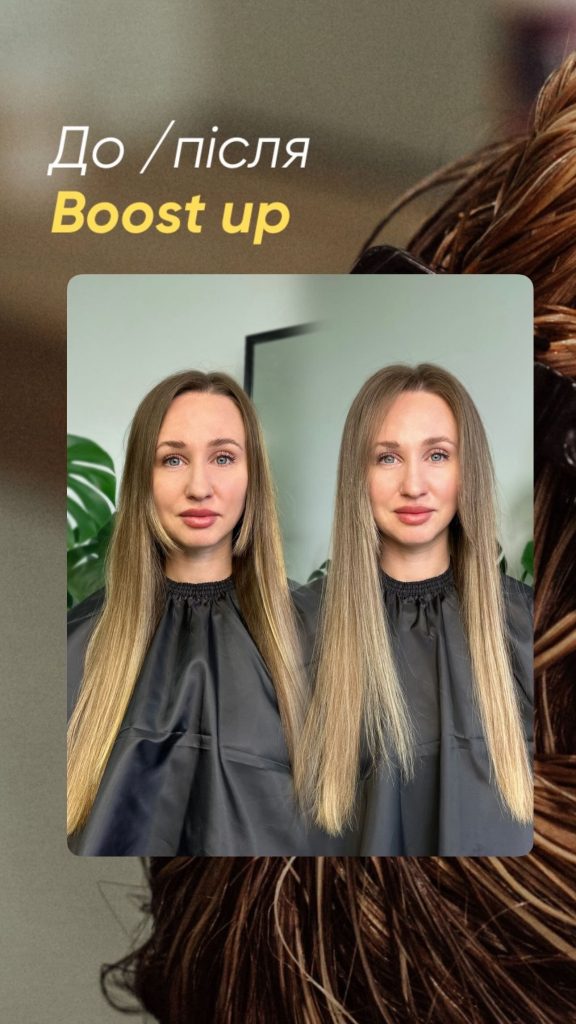 В кінці процедури boost up зона, де було зроблено прикореневий об'єм укріплюється за допомогою амінокислотного відновлення, яке діє глибоко у кортексі волосини, як наслідок — безпечна процедура перманентного об'єму і міцне волосся.
